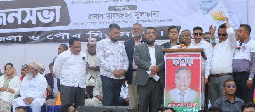 তিনি আরও বলেন, জনগণের ভোটাধিকার ও গণতন্ত্র পুনরুদ্ধার বিএনপির রাজনীতির মূল লক্ষ্য। ভোলা-২ আসনের সার্বিক উন্নয়ন, শিক্ষা ও স্বাস্থ্যখাতের উন্নয়ন এবং কর্মসংস্থান সৃষ্টিতে আমি আন্তরিকভাবে কাজ করতে চাই। বোরহানউদ্দিন উপজেলা বিএনপির আহ্বায়ক মাফরুজা সুলতানার সভাপতিত্বে বক্তৃতা করেন-জেলা মুক্তিযোদ্ধা কমান্ড কাউন্সিলের আহবায়ক মাহফুজুর রহমান, জেলা বিএনপি’র যুগ্ম আহ্বায়ক ফজলুর রহমান বাচ্চু মোল্লা, উপজেলা বিএনপি’র উপদেষ্টা আল এমরান খোকন, দৈনিক খবর পত্রের সম্পাদক ব্যারিস্টার মারুফ ইব্রাহীম আকাশ, উপজেলা বিএনপি’র সিনিয়র যুগ্ম আহবায়ক সরোয়ার আলম খাঁন, আহবায়ক শহিদুল আলম নাছিম, সদস্য সচিব অ্যাডভোকেট কাজী মোহাম্মদ আজম প্রমুখ। জনসভায় হাজার হাজার নেতা-কর্মীসহ সাধারণ ভোটারের উপস্থিতি দেখা যায়।